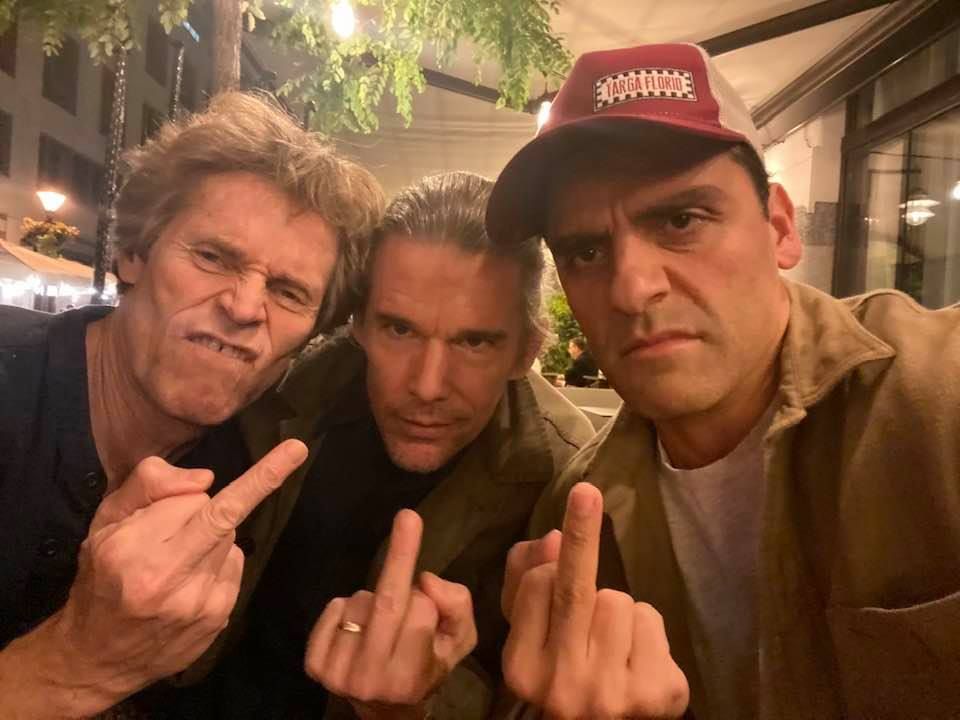 Obviously the three stars featured in the above image are only kidding around as they flip the bird at Schrader. Which isn’t to say that Schrader can’t sometimes be an irascible fellow who arguably earns a good middle finger fired in his direction. Indeed Schrader has long been controversial both for the subject matter he tackles in his films and for things he says in interviews and on social media. Given his uncompromising nature, it’s certain that there can be moments of friction on Schrader’s films as well. No doubt the good-natured joking implied by Isaac, Dafoe and Hawke’s triple-bird is only half the story.